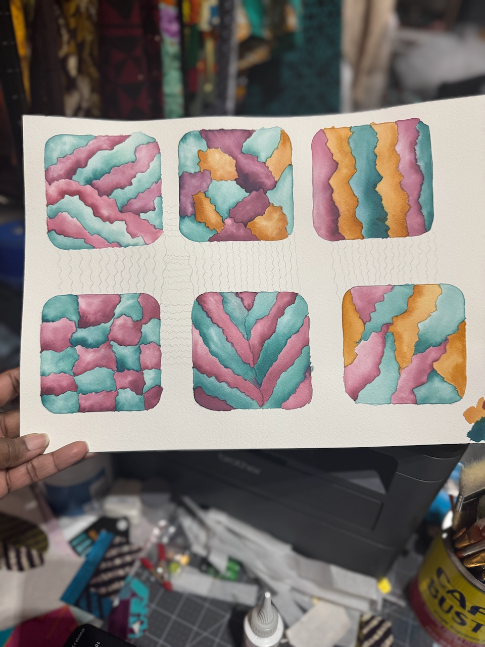 I knew I wanted to fill the flower petals with texture, kind of like I did with the Big Dahlia Energy scarf, but with watercolor. I looked back at some of the motifs I'd painted this winter when I got back from Italy, and thanked my past self. I'd painted some motifs that were reminiscent of weavings, inspired by the ornamentation I saw on museum trips in Florence. I'd forgotten about those paintings almost as soon as I'd painted them and was kind of in awe to see that not only would they work for this design, they were already the right colors.