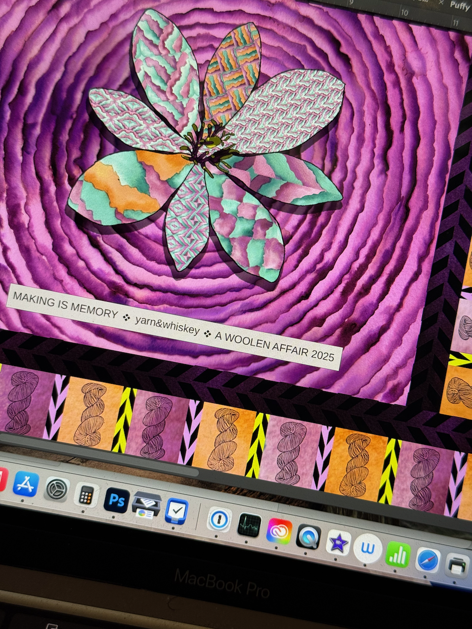 I scanned everything in, made some color adjustments, did a little more painting for the background color because I wanted it to have the same feeling as the center image, and added a totem — a skein of yarn — to mark our meeting of the makers. Kangas usually have a motto or slogan on them and I thought Making is Memory captured the theme — "We teach each other, we collect knowledge, we pass it on to the next generation."