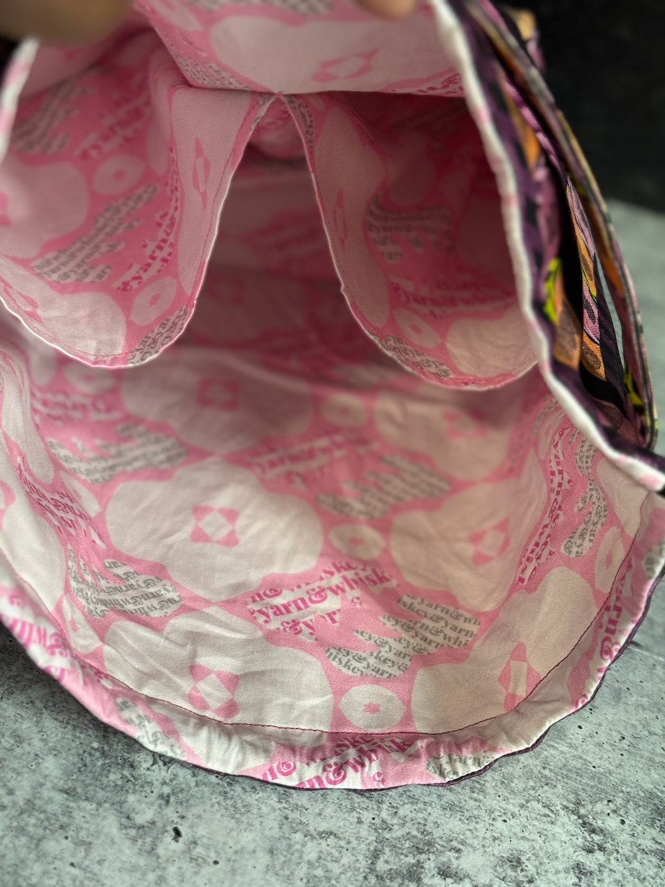 The bag is lined in a new pink version of my logo fabric, picking up some of the lighter shades on the outside of the bag. It has two pockets, as usual and the bag itself has a nice boxed out bottom allowing it to stand on its own. And of course, it's got a great handle making it the perfect bag to grab on the go.